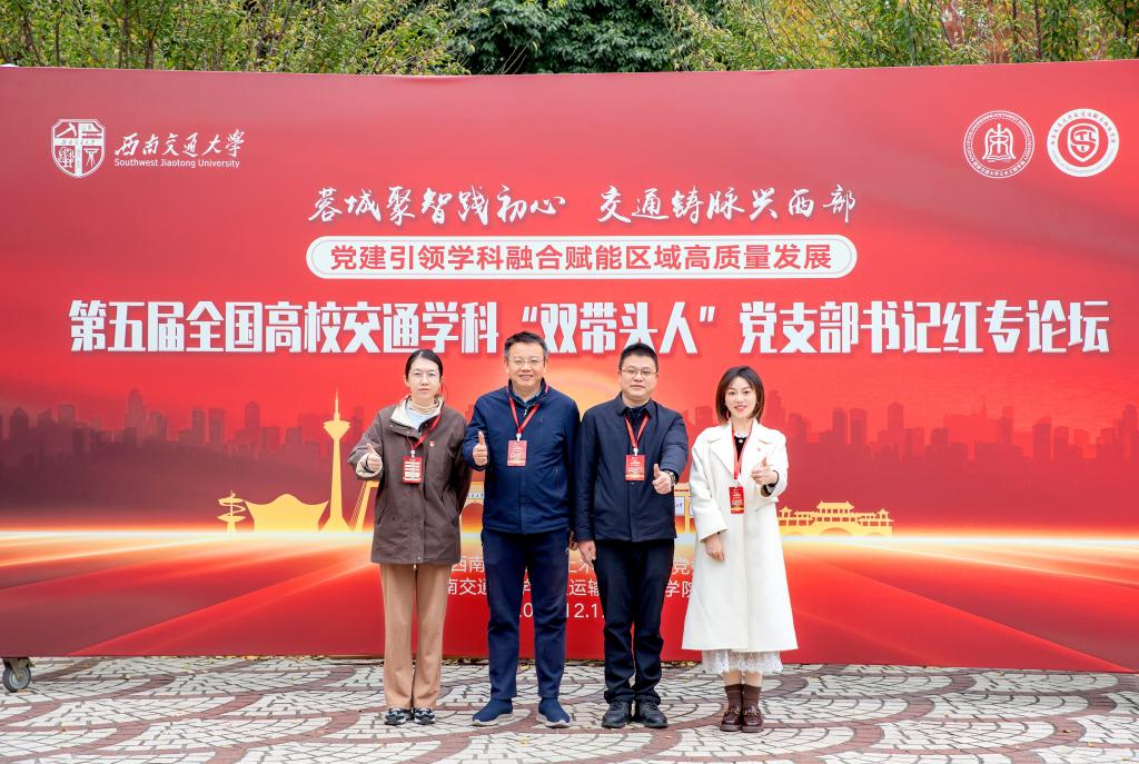 12月12日-12月14日,第五届全国高校交通学科“双带头人”教师党支部书记红专论坛在成都西南交通大学召开。本次论坛以“蓉城聚智践初心,交通铸脉兴西部——党建引领学科融合赋能区域高质量发展”为主题,旨在深入学习贯彻习近平新时代中国特色社会主义思想和党的二十大四中全会精神,落实新时代党的建设总要求和新时代党的组织路线,进一步加强高校交通学科“双带头人”教师党支部书记模式建设,推动党建工作与学科建设、人才培养、科学研究等中心工作同频共振、互促共进。我院道路工程系第一党支部书记纪小平教授、桥梁工程系第二党支部书记王晓明教授、党委秘书郭洋、路桥研究生党支部书记许元珺应邀参会。